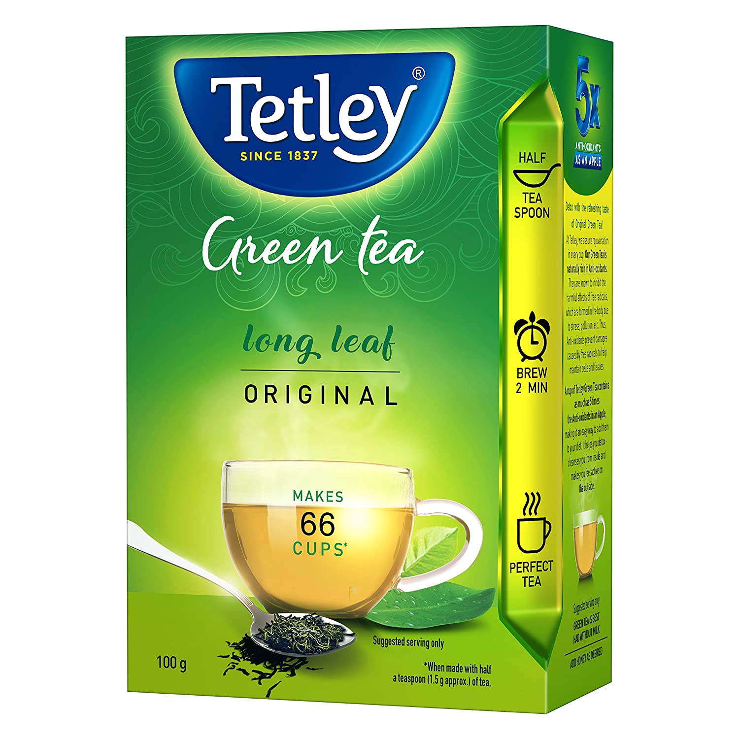 Start afresh with Tetley! To stay refreshed all day, sip the refreshing Tetley Long Leaf Green Tea. Being an excellent source of antioxidants, Tetley Green Tea has various beneficial effects on health such as it helps you feel relaxed by hydrating your body and flushes out all the toxins from your body. The finest and long tea leaves are blended for a smooth and soft taste with an all-natural green tea flavor. You can now enjoy freshness whenever and wherever you want, such as after breakfast, before exercise, or before bedtime. USAGE INSTRUCTIONS: Add just ½ tbsp. of Green Tea Leaves to boiling water. Brew the tea for 2 minutes. Add honey if desired & enjoy the perfect green tea!