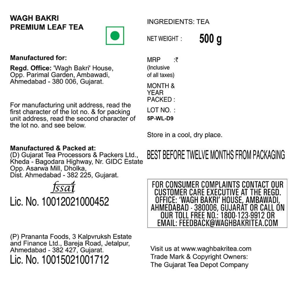 | Ingredients | Wagh Bakri Leaf Tea Poly Pack, 500g Material : vegetarian |